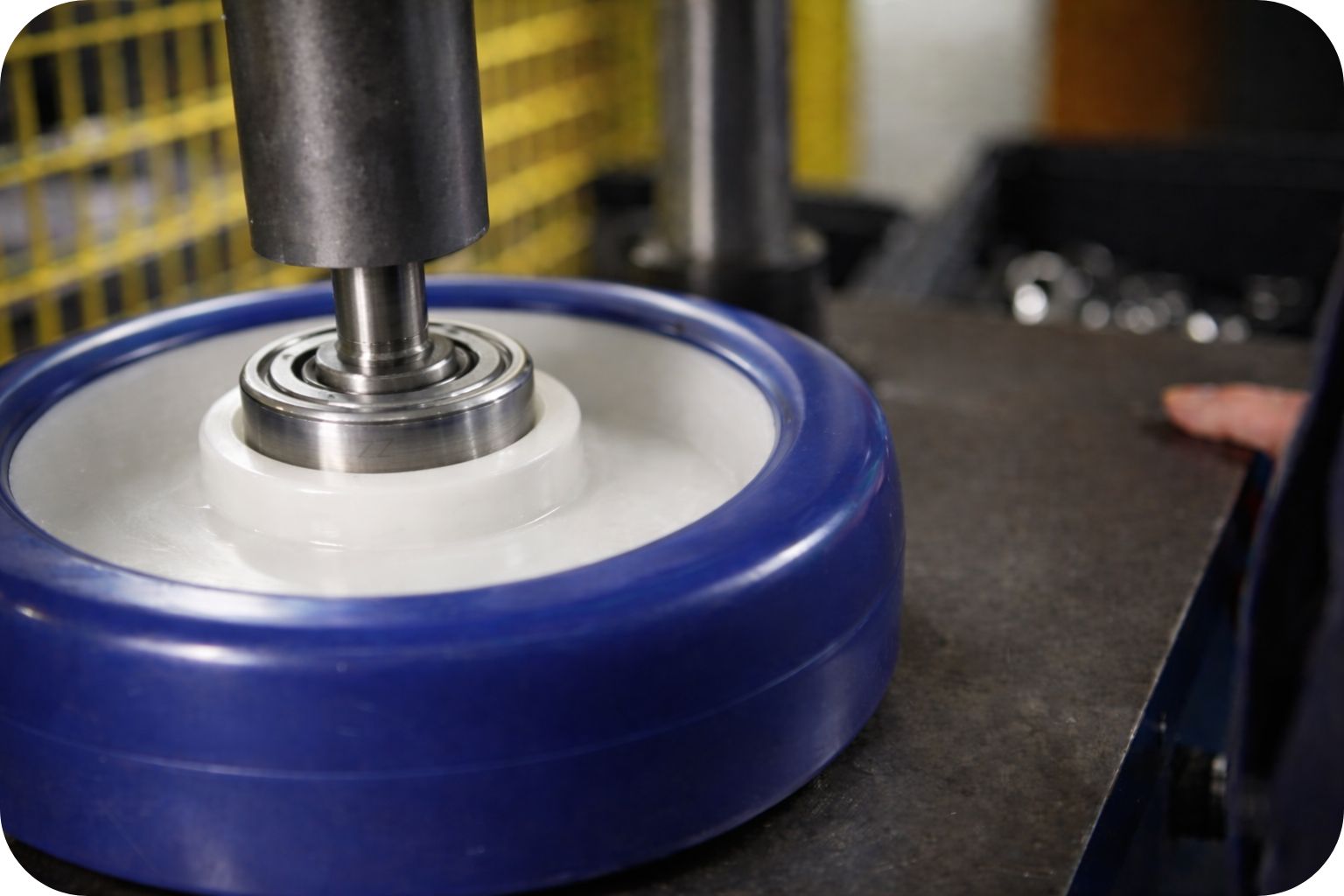 Mit einer Montagehülse wird das Lager mit leichten, gleichmäßigen Schlägen montiert. Die Hülse muss vollflächig und plan auf dem richtigen Ring anliegen. Mit einer Presse wird das Lager kontrolliert und exakt ausgerichtet in seine Position gedrückt. Bauen Sie die Kraft gleichmäßig auf und kontrollieren Sie, dass das Lager nicht verkantet. Bei korrekter Montage ist deutlich spürbar, wenn das Lager am Anschlag anliegt.